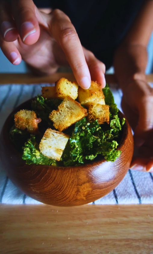 Avocado Massaged Kale Salad with Homemade Croutons
