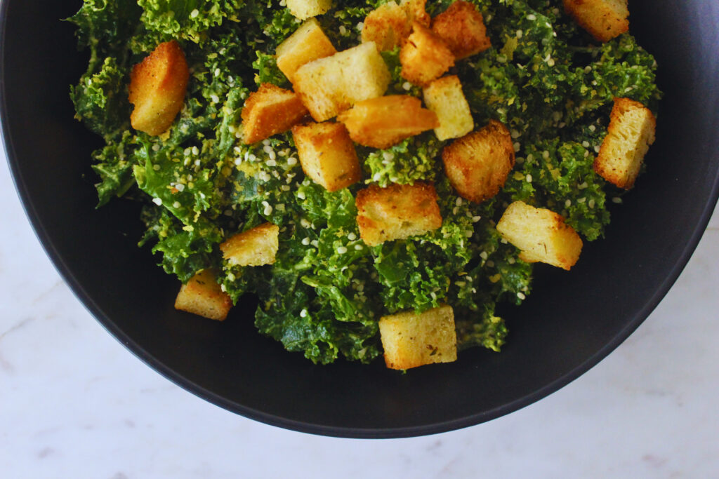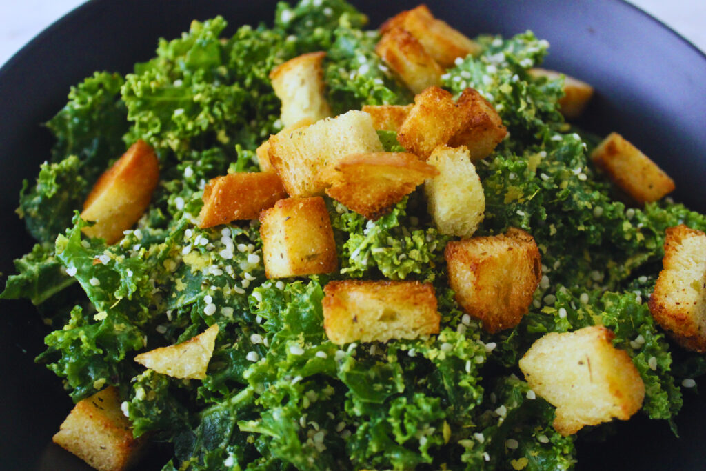 image of avocado massaged kale salad with homemade croutons
