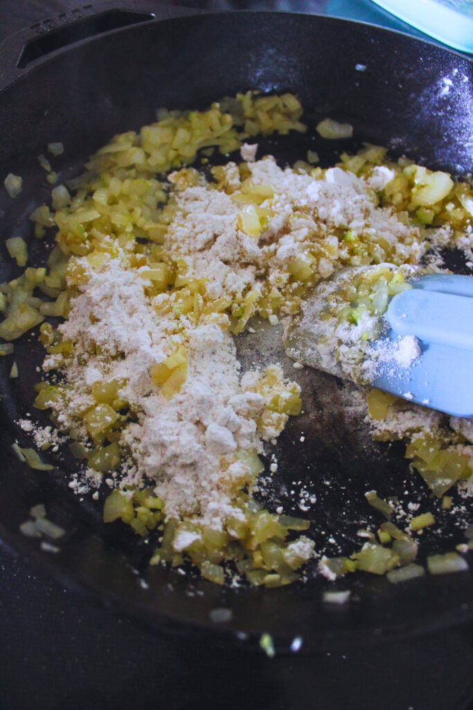 - Add in the flour and cook that for a couple minutes to remove the raw flour taste and smell.