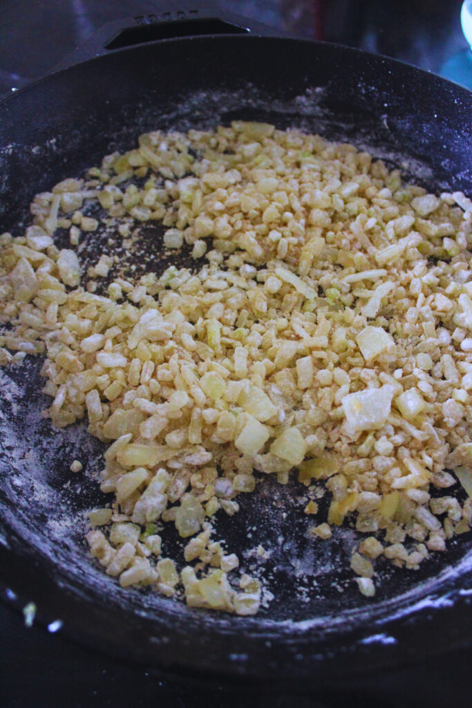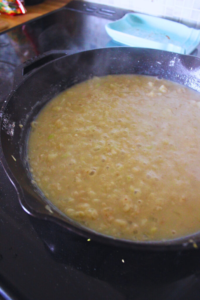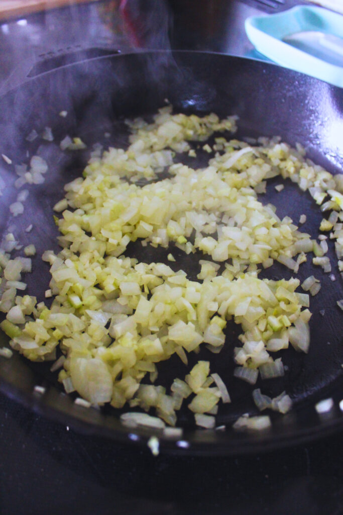 - In a 10 inch cast iron skillet, melt butter over medium high heat. Once butter has melted add in the onion, celery, and garlic. Let that cook until soft and onion is translucent.