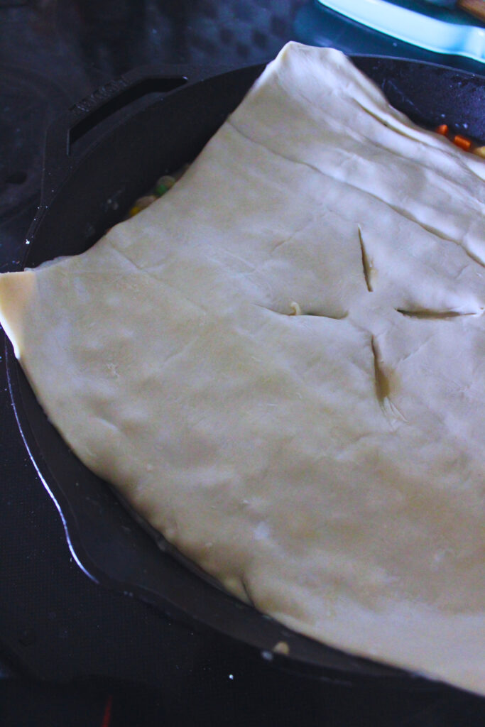 - Once everything is incorporated, turn off the heat and add the puff pastry over the top of the iron skillet. Brush on some plant milk and sprinkle with salt. Cut some slits for air flow and cuteness.
