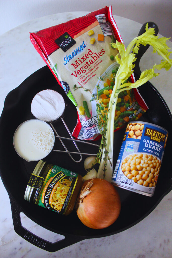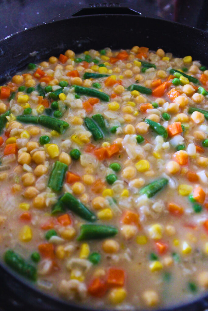 - Add ½ cup plant milk and stir that in until there are no more clumps and you get a creamy béchamel consistency. Then add 1½ cup no chicken base broth, 2 cups frozen veggie mix, and drained 1 can chickpeas.