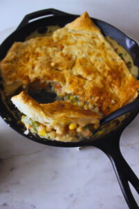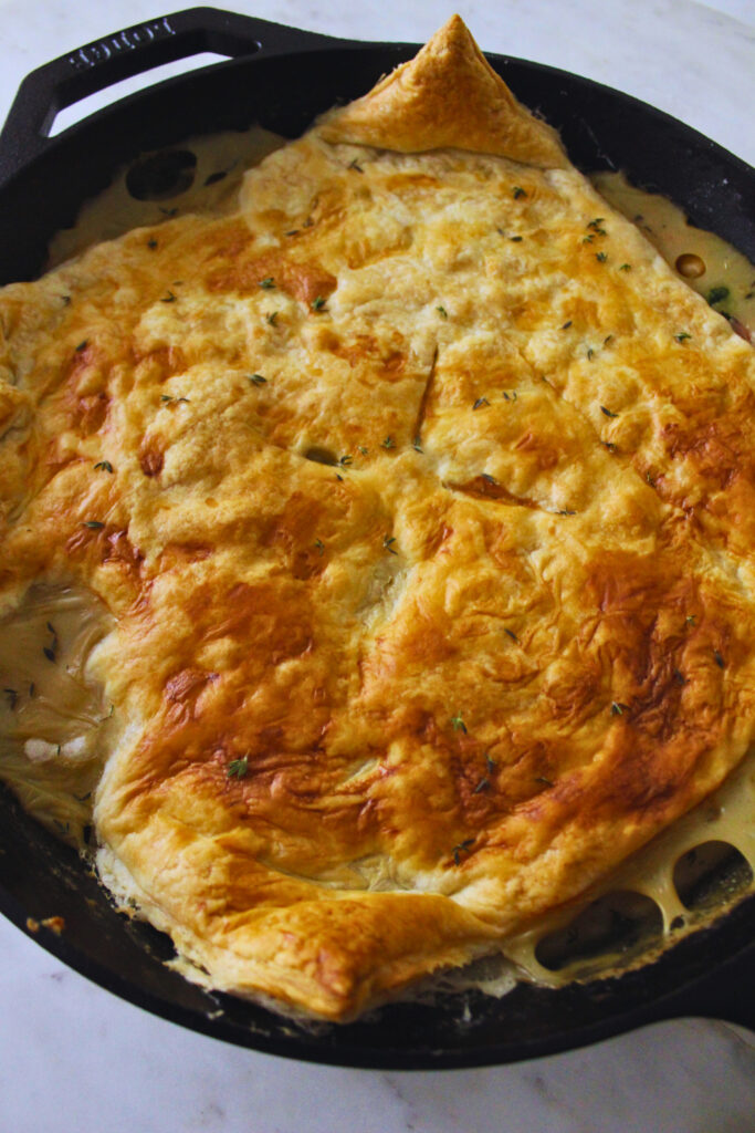 - Once everything is incorporated, turn off the heat and add the puff pastry over the top of the iron skillet. Brush on some plant milk and sprinkle with salt. Cut some slits for air flow and cuteness. Bake in the oven at 400℉ for about 30 minutes or until puff pastry is golden brown.