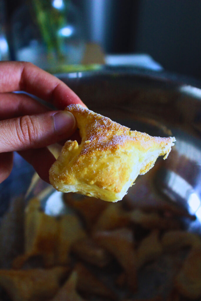 If you decided to cut these into circles you'll be left with some scrap dough. Simply cut the scraps to be these little abstract shapes that you can quickly bake in the oven. Coat them in a little oil and toss with some powdered sugar. You can dip these in chocolate, or coat them in spices such as cinnamon. Use whatever you enjoy - these make a fun little treat.
