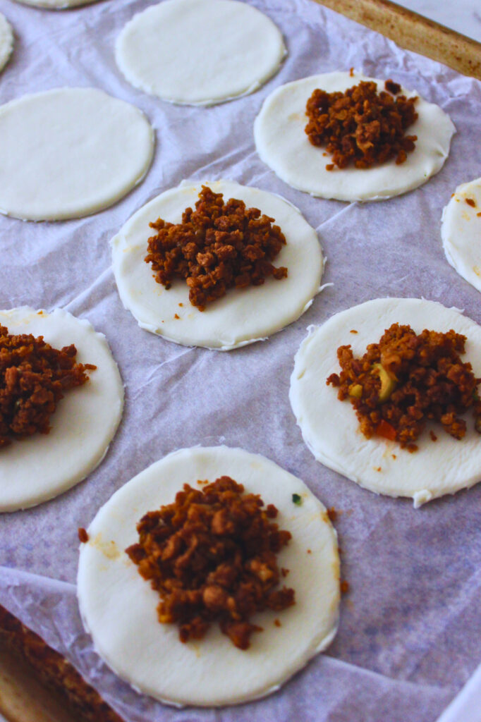 • Separating half of the dough you cut, use a spoon to scoop up the vegan be'f and fill the center. Make sure to leave about ½ inch border.