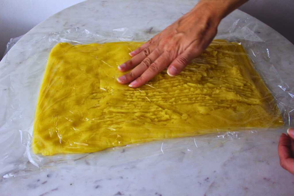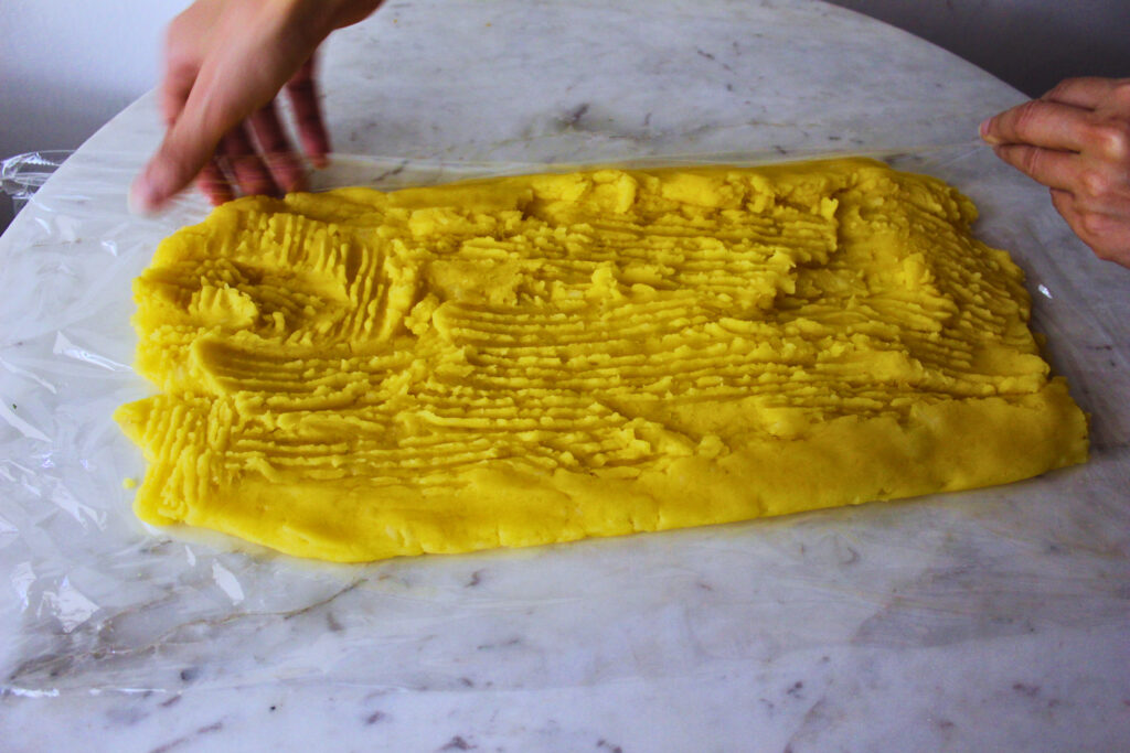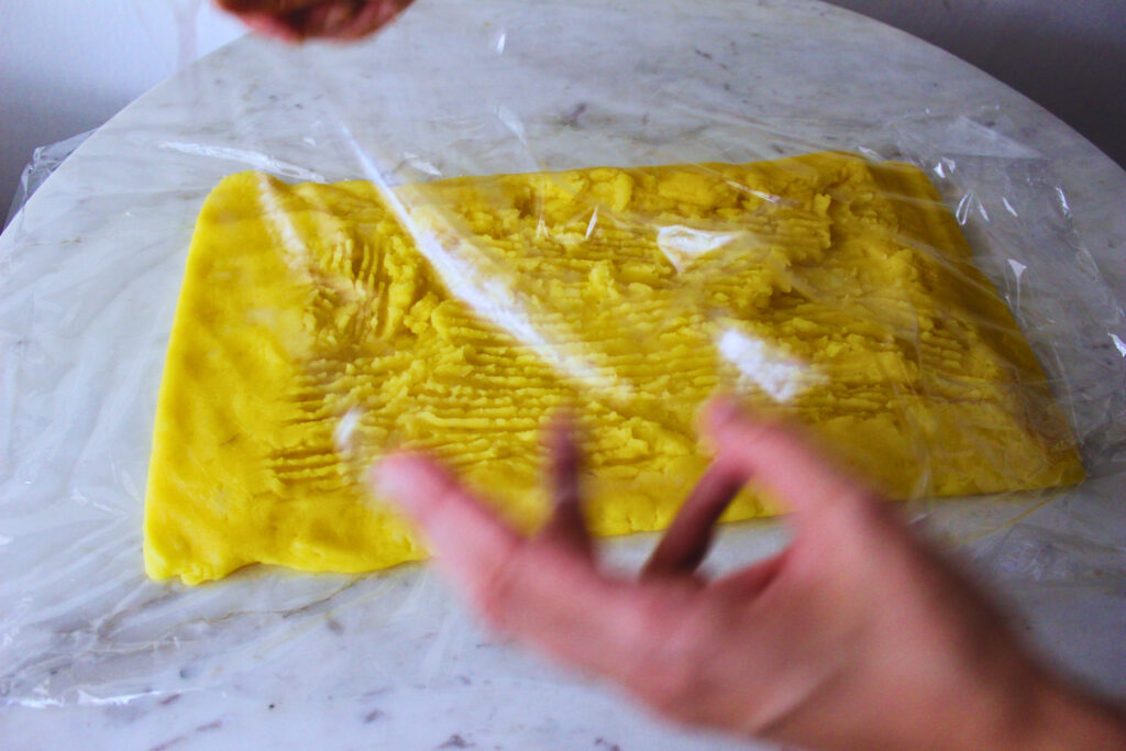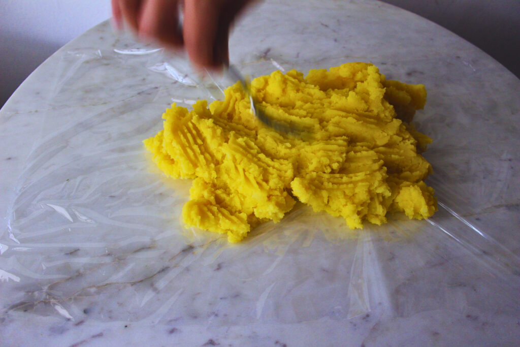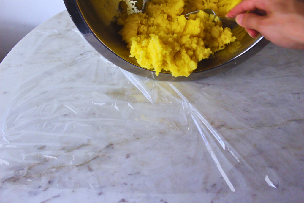 - Once the potato has cooled, evenly spread it on top of some parchment paper or plastic wrap.