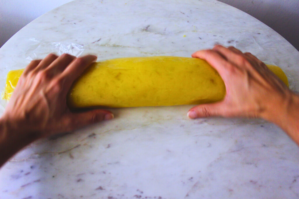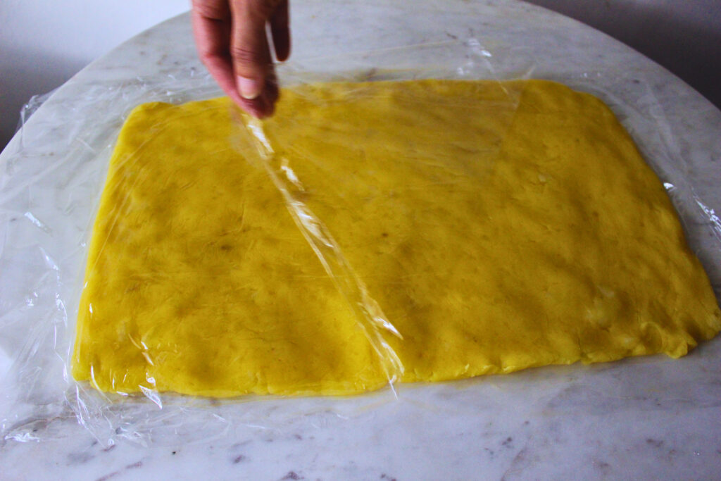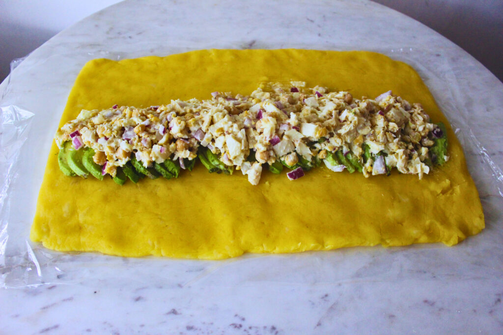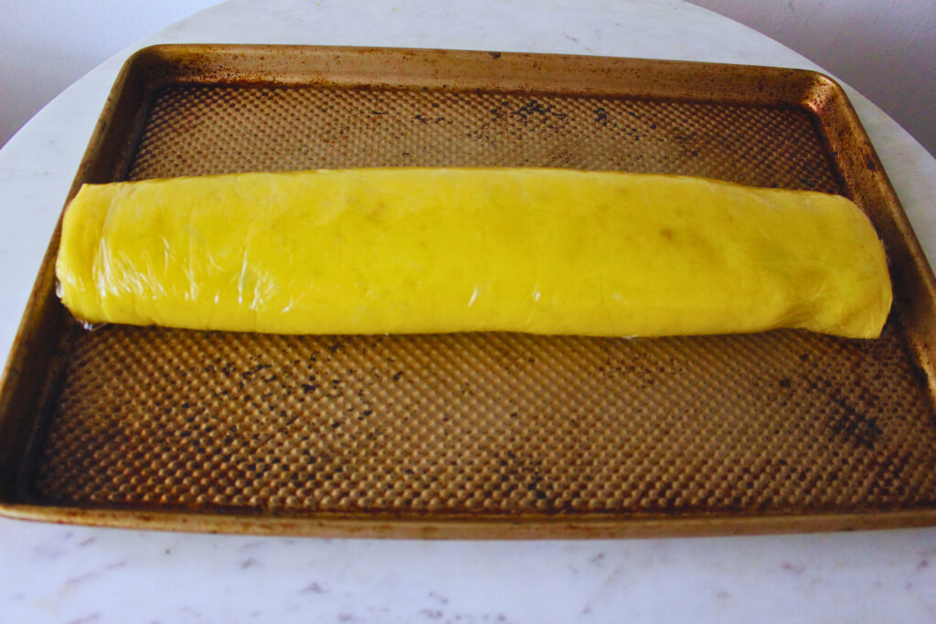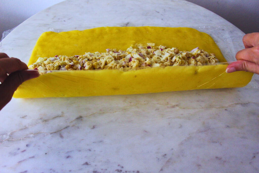 - Wrap the rolled-up causa tightly in plastic wrap and refrigerate it for at least an hour to firm up.