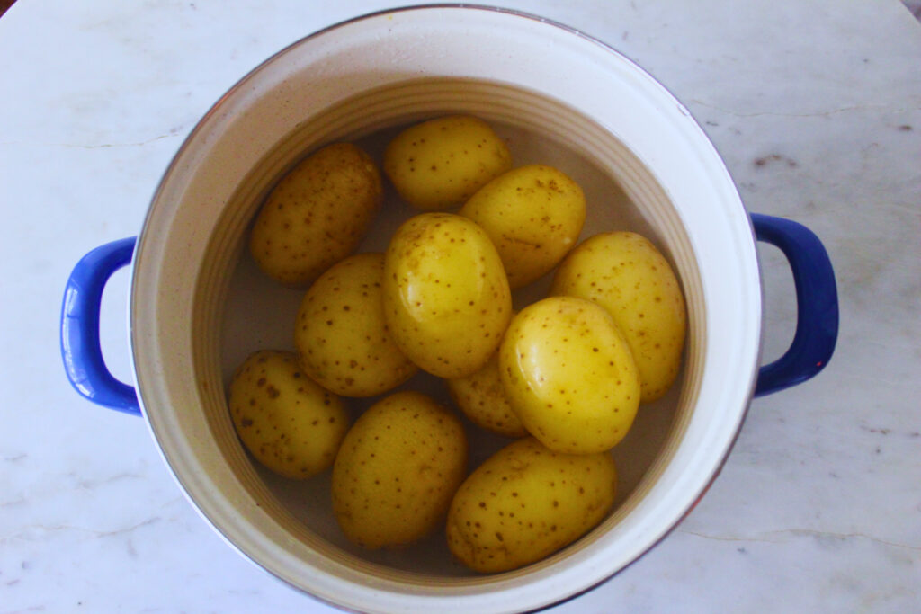 - Start by boiling 3 lbs yellow potato in water with salt until you can easily pierce them with a fork.