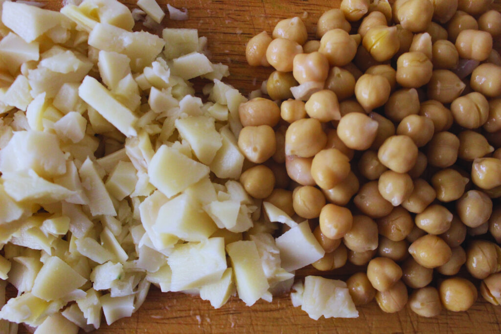 - Chop and mash 1 can heart of palms and 1 can chickpeas. Toss it into a mixing bowl with ¼ cup vegan mayonnaise, ½ onion chopped, salt and pepper.
