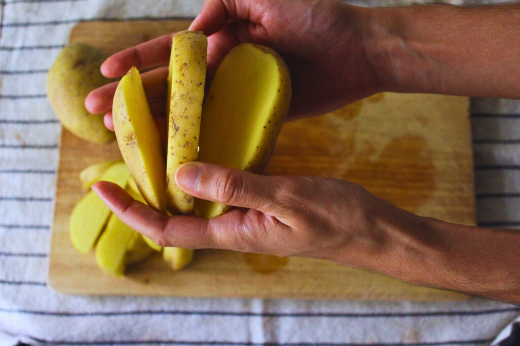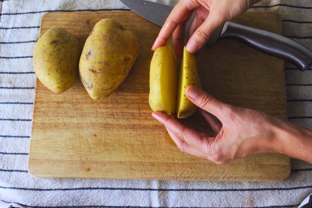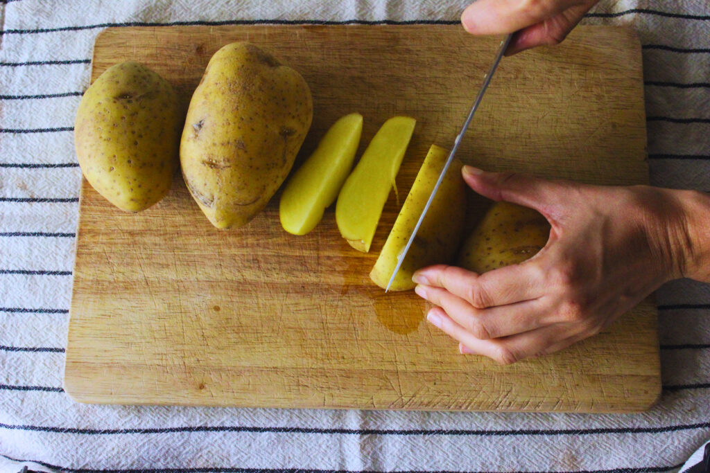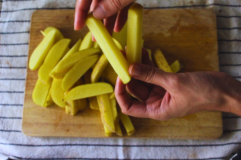 Cutting the potatoes into batons is quite simple. Just remember you are always going to be cutting the length that is longest - and depending on the width of the potato, decide to cut it down the center or into thirds length wise (see first two images below). Once you have your potato cut into two or three slices, cut those length wise. If you notice you have some thick wedges, you can always cut them down. It's okay if you have some smaller pieces, they get extra crunchy and we personally love them.