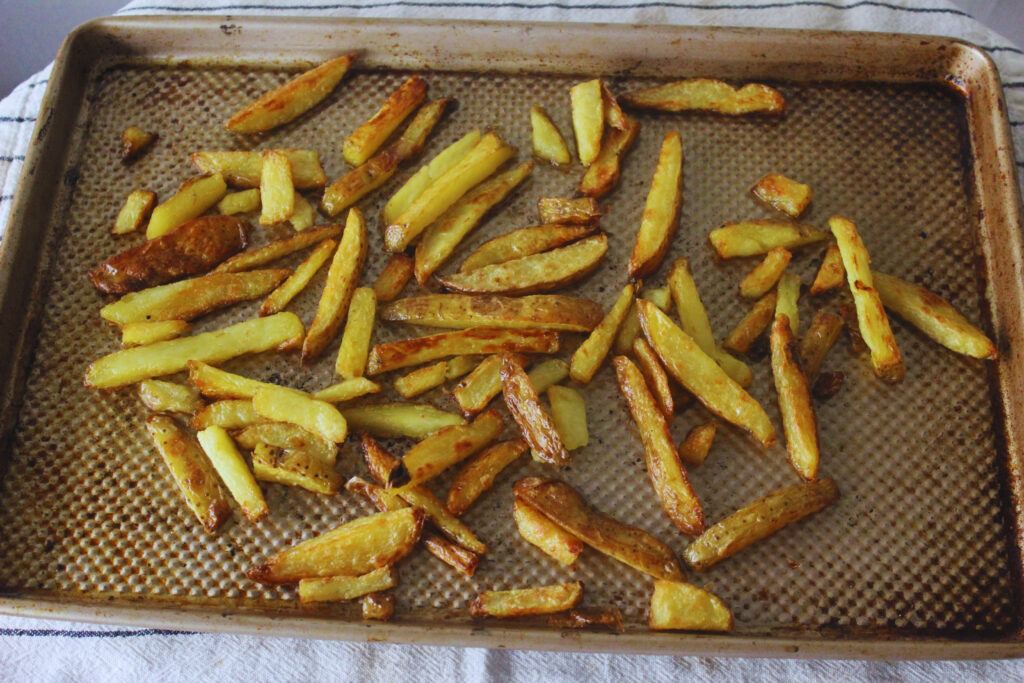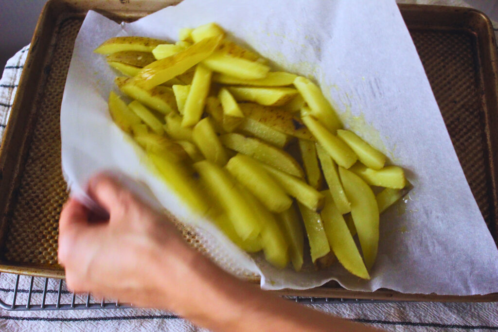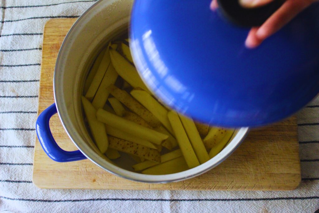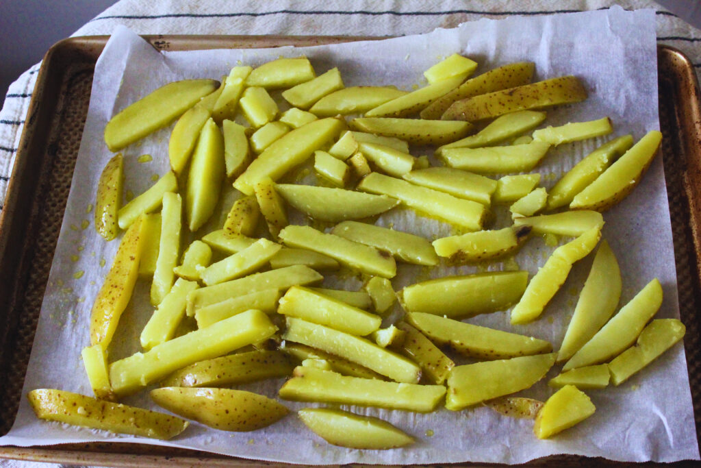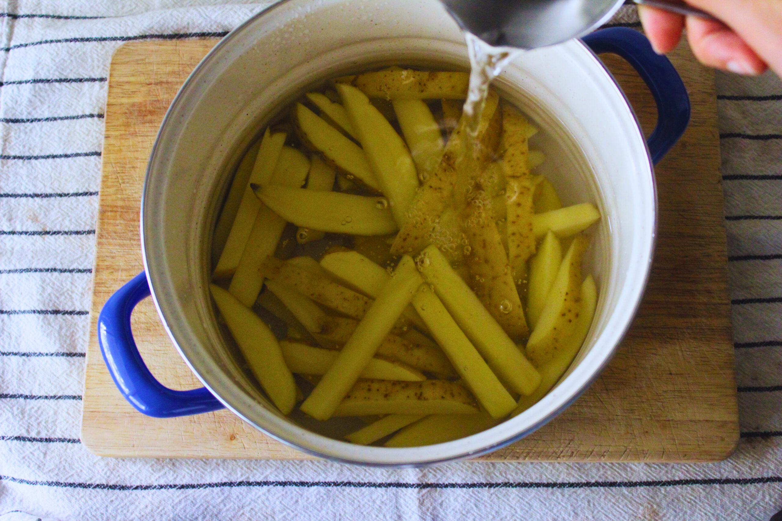 Once the potatoes are washed and cut, the next steps are quite easy. This is a two step cooking process that involves boiling and baking, but don't be discouraged. Once you taste the deliciously crunchy fries, you'll take the extra step every time you make fries. Also, it isn't much active cooking time, you just need to set a timer and be around.