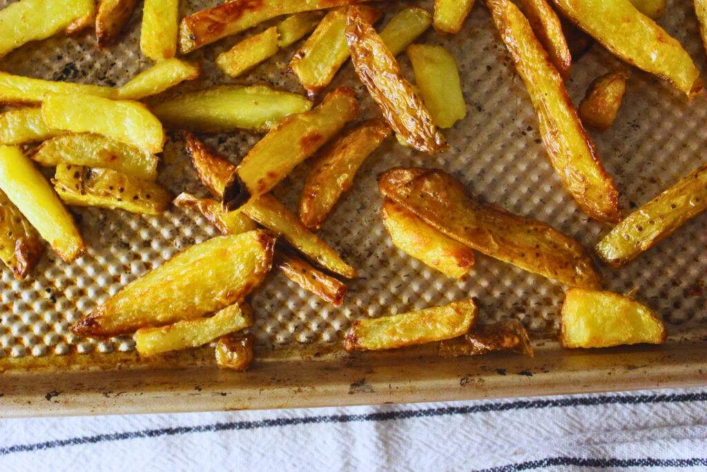 We rarely peel a vegetable. Vegetable skins contain lots of fiber, vitamins and minerals. Plus, it saves us those extra minutes in the kitchen. The potato skin also adds a nice extra crispy crunch to these fries.