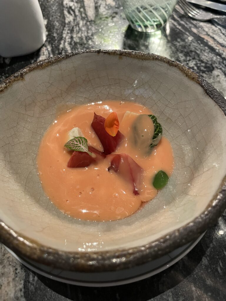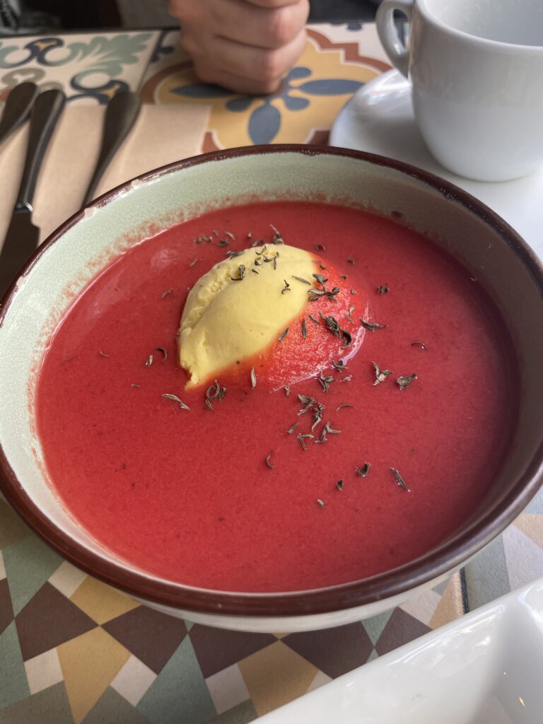 While we were in Spain in August we got to try so many different kinds of gazpacho! It was incredible! We had gazpacho that had beets, corn, a basil sorbet, a mango sorbet, the variety was endless! They were all delicious and so refreshing in the heat of summer in Spain.