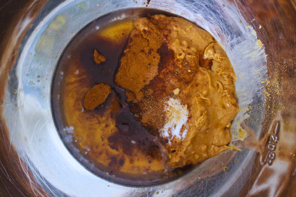 1. Combine peanut butter, maple syrup, coconut oil, vanilla extract, and spices.