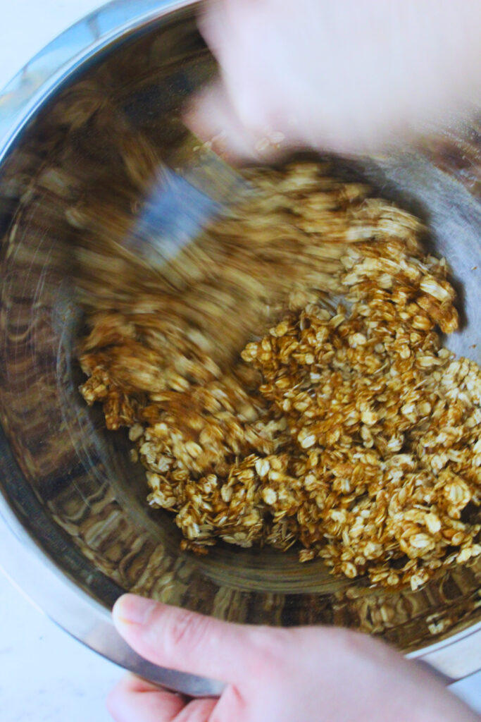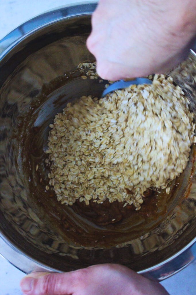 • Add the oats to the wet mixture and stir to thoroughly coat.
