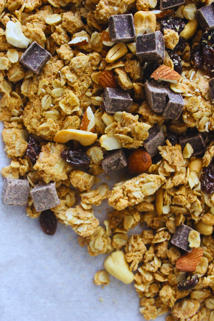 • Add the chocolate chips or chunks once the granola has cooled fully to avoid them melting.