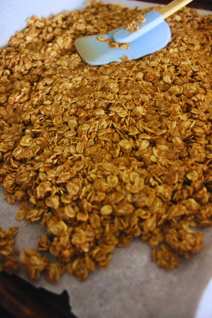 • Evenly spread the granola on a large baking sheet making sure to press down on the oats.