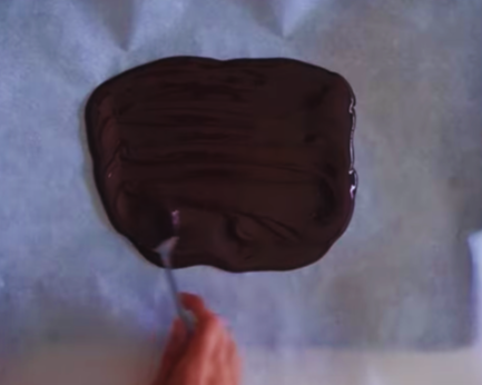 4. Line a baking tray with parchment paper and pour the melted chocolate, save a little to drizzle the top.