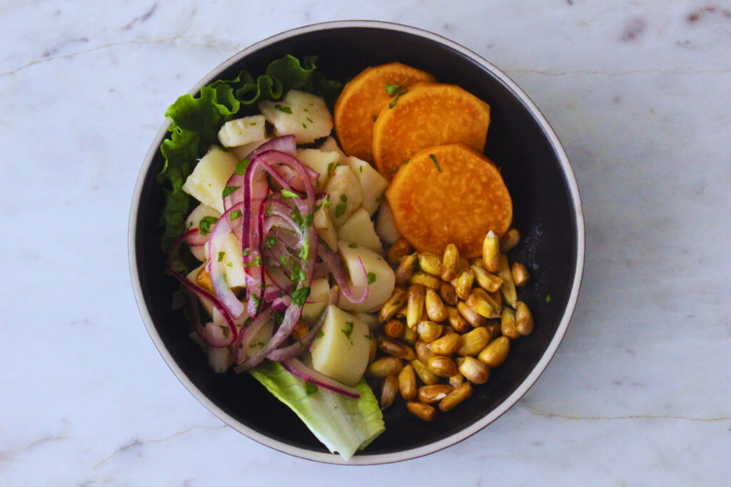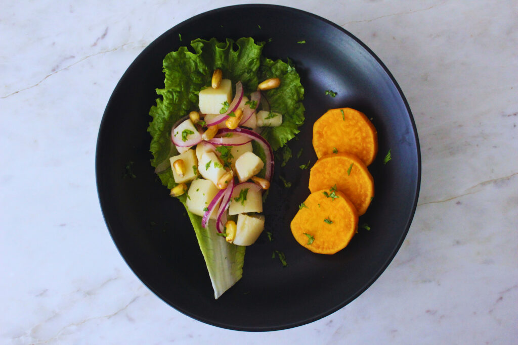 - While the sweet potato cooks, chop 8 oz heart of palm, 2 Tbsp cilantro and slice ½ red onion.Mix the heart of palm, cilantro, and red onion with 3 limes juiced and 1 Tbsp aji amarillo paste. Add ¼ tsp salt cover and let it sit in the fridge for at least 10 minutes to allow the flavors to develop.8 oz heart of palm, 3 limes, ½ red onion, 1 Tbsp aji amarillo paste, 2 Tbsp cilantro, ¼ tsp salt