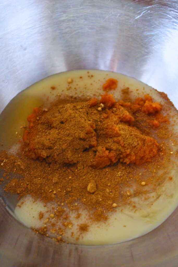- Combine the condensed milk, pumpkin puree, and pumpkin spice mix in a bowl.