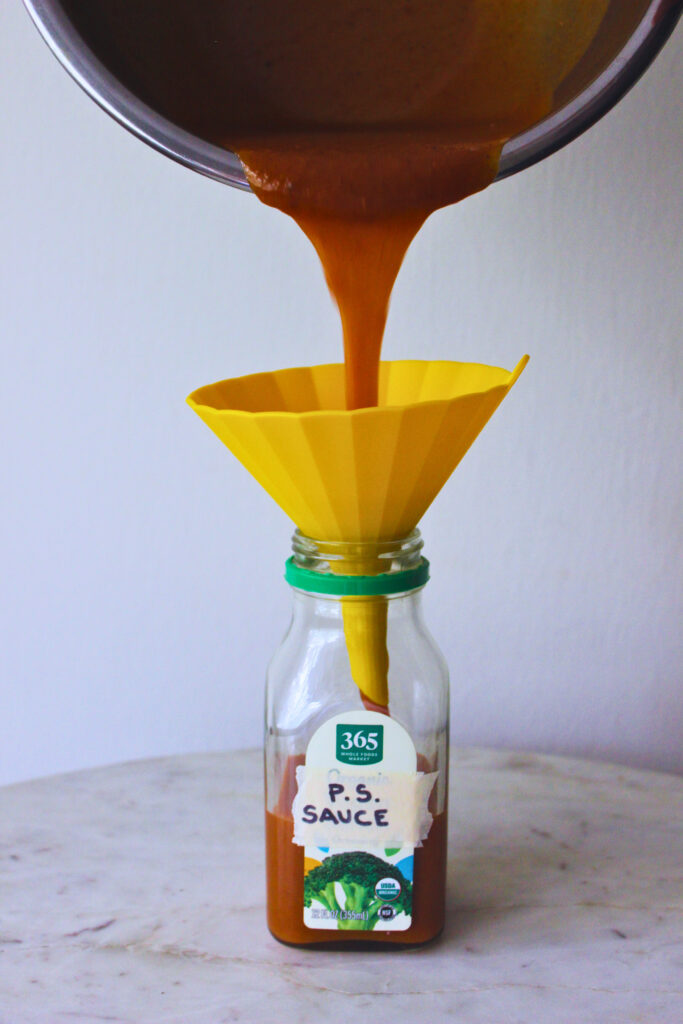 Pour into an airtight container, and store in your fridge for 1 - 2 weeks. Keep in mind the mixture will thicken a bit once refrigerated and probably wont pour out of the container as easily. Use a container that has a large enough opening were you can use a spoon to scoop some syrup out, or transfer the sauce into a squeezable bottle.