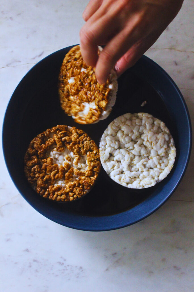 - Place the rice cakes in the coffee maple syrup mixture, allow to soak on each side for a few seconds.