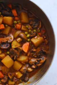 - Once the potatoes are soft (check by piercing one with a fork or knife), add in the cooked mushrooms and ½ cup frozen peas, and let that simmer on low heat for 10 minutes or until the peas are fully thawed and soft.