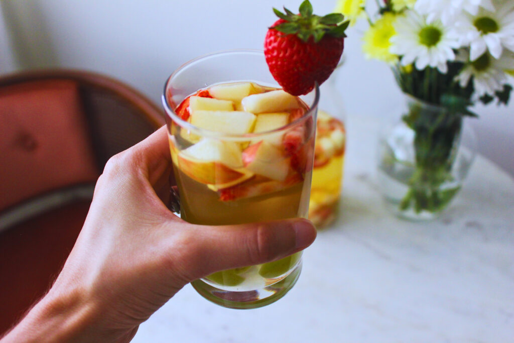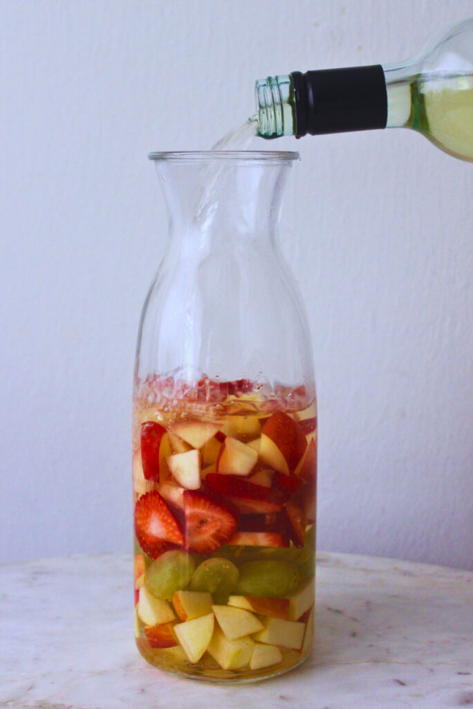 White wine sangria is a simple cocktail recipe that can be easily modified to your liking. Use fruits you enjoy and toss them in with some white wine and fruit juice. If you prefer to have more alcohol mix in a little triple sec and vodka.