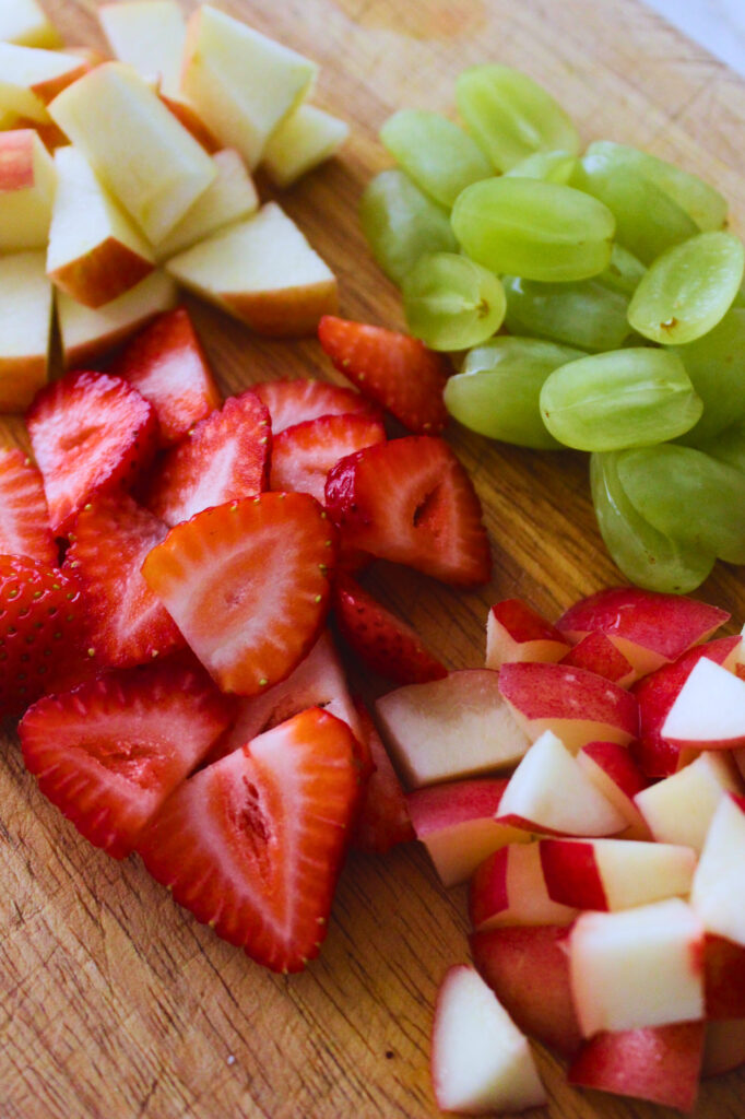 - Slice the grapes in half, dice the apple and nectarine, slice the strawberries.