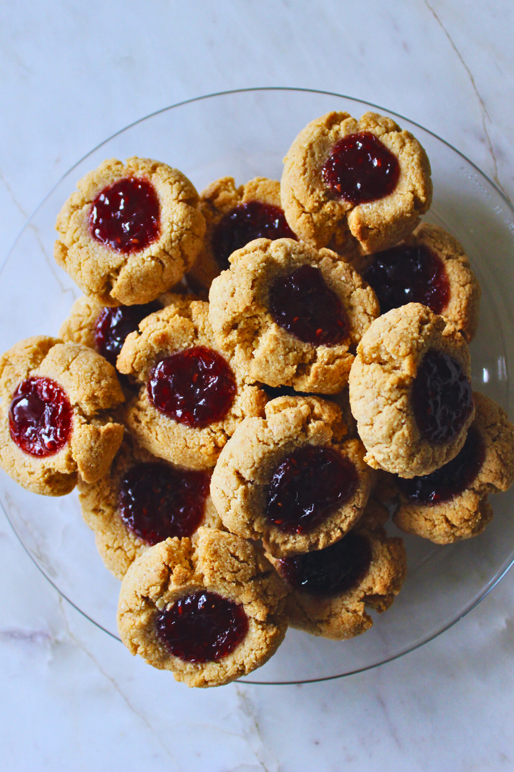 - Form: To make about 15 cookies, use a tablespoon measure to scoop out the dough. Roll the cookie dough between your hands and place the ball on a baking sheet. Use the back of a ½ tablespoon measure to press down on the center of the dough. This will create a little cavity in the cookies to place the jam filling. The sides of the dough will crack, that's part of their rustic charm.