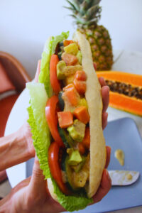 - Chop the mango, pineapple, papaya and avocado. Toss it together in a bowl and add it to the sandwich.